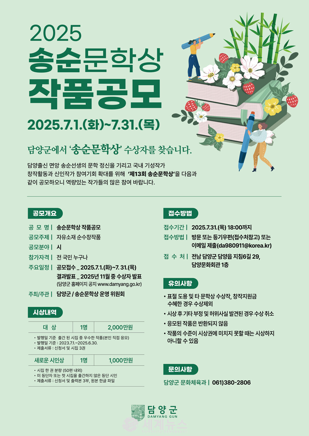 군 관계자는 “송순문학상은 문학성을 갖춘 시인들에게 열린 무대이자, 문학을 통해 담양의 정체성을 이어가는 문화 브랜드”라며 “전국의 많은 시인과 예비 작가들의 적극적인 참여를 기대한다”라고 밝혔다.