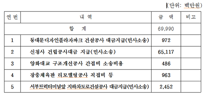 서울시 도시기반시설본부(시설국) 2016회계연도 결산보고서를 살펴보면 서울시는 총 5건의 간접공사비 지급 소송에서 패소하여 판결금 669억 9천만원을 예비비로 지급했다.