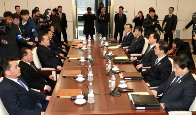 | ▲ (우측) 수석대표인 조명균 통일부 장관과 북측 수석대표인 리선권 조국평화통일위원회 위원장 등 양측대표단이 9일 판문점 남측지역 평화의집에서 남북고위급 회담을 열고 있다. 왼쪽부터 북측 대표단인 황충성 조국평화통일위원회 부장, 전종수 조국평화통일위원회 부위원장, 리선권 조국평화통일위원회 위원장, 원길우 체육성 부상, 리경식 민족올림픽조직위원회 위원. 오른쪽부터 안문현 국무총리실심의관, 천해성 통일부 차관, 조명균 통일부 장관, 노태강 문화체육관광부 2차관, 김기홍 평창올림픽·패럴림픽 기획사무차장. (사진공동취재단) © 세계뉴스 |