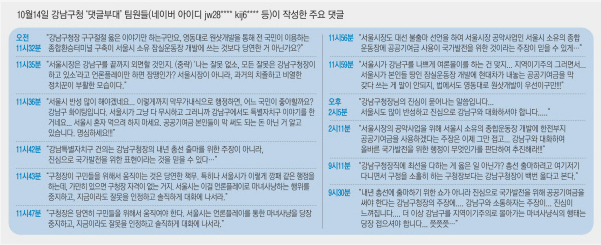 이어 팀원 김모씨(7급)는 오전 11시43분 아이디 ‘kij6****’로 ‘신연희 서울 강남구청장 “내년 총선 출마 안 한다”’ 기사에 “구청장이 구민들을 위해서 움직이는 것은 당연한 책무. 특히나 서울시가 이렇게 깡패 같은 행정을 하는데, 가만히 있으면 구청장 자격이 없는 거지. 서울시는 이걸 언론플레이로 마녀사냥하는 행위를 중지하고, 지금이라도 잘못을 인정하고 솔직하게 대화에 나서라”고 썼다.