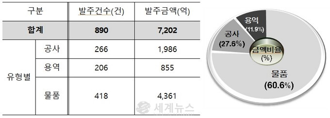 올해 총 발주 예정 건은 물품 418건, 공사 266건, 용역 206건으로 총 890건· 7,202억 원에 달하는 규모다.