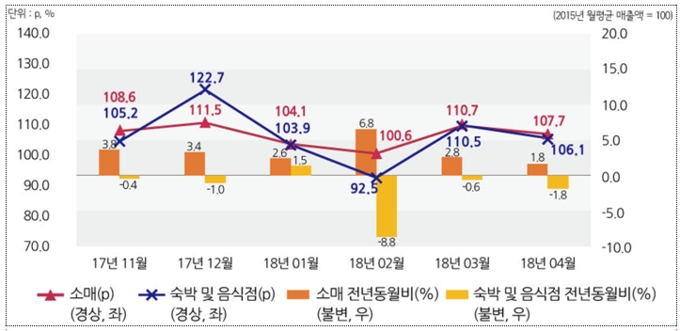 숙박·음식점업은 숙박업의 증가세가 지속되었음에도 불구하고 음식점업 및 주점·비알콜음료 소비가 줄며 전년 동월 대비 1.8% 감소했다.