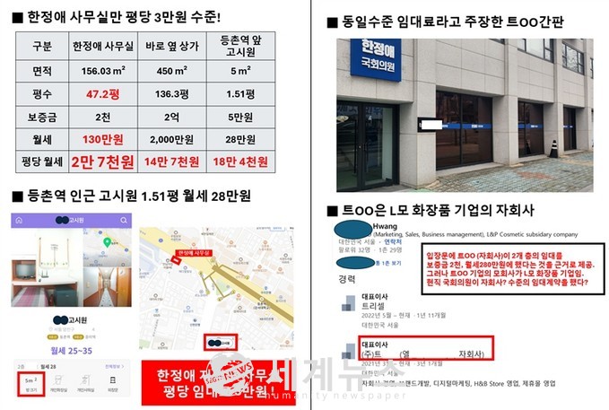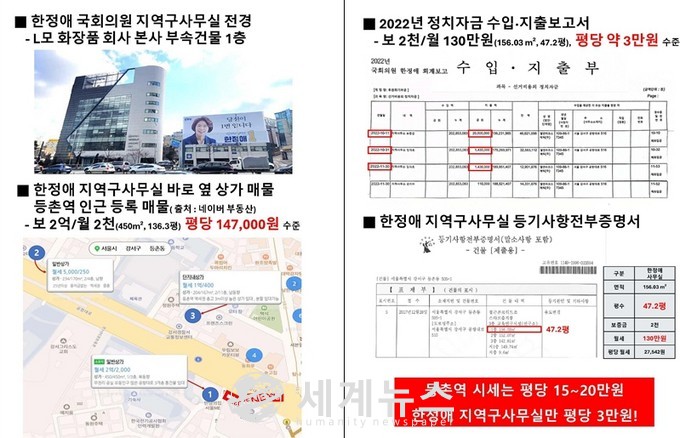 [세계뉴스 전승원 기자] 서울특별시의회 김경훈 의원(국민의힘 서울시당 중소상인살리기특별위원장)이 2일 국회 정론관에서 한정애 의원 지역구사무실 평당 월 임대료 3만원의 증거자료를 전격 공개했다.
