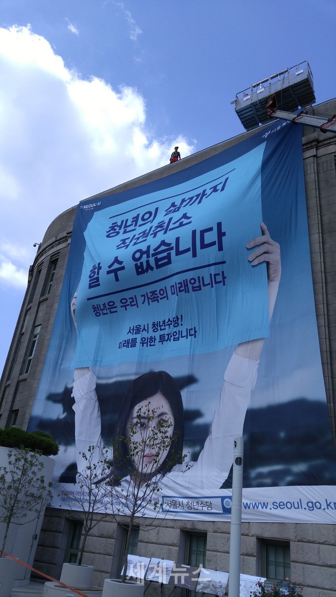 | ▲ 4일 오후 3시경 서울시는 시청사 건물에 ‘청년의 삶까지 직권취소 할 수 없습니다’ 대형현수막을 내걸고 복지부와 일전을 알렸다. © 세계뉴스 |