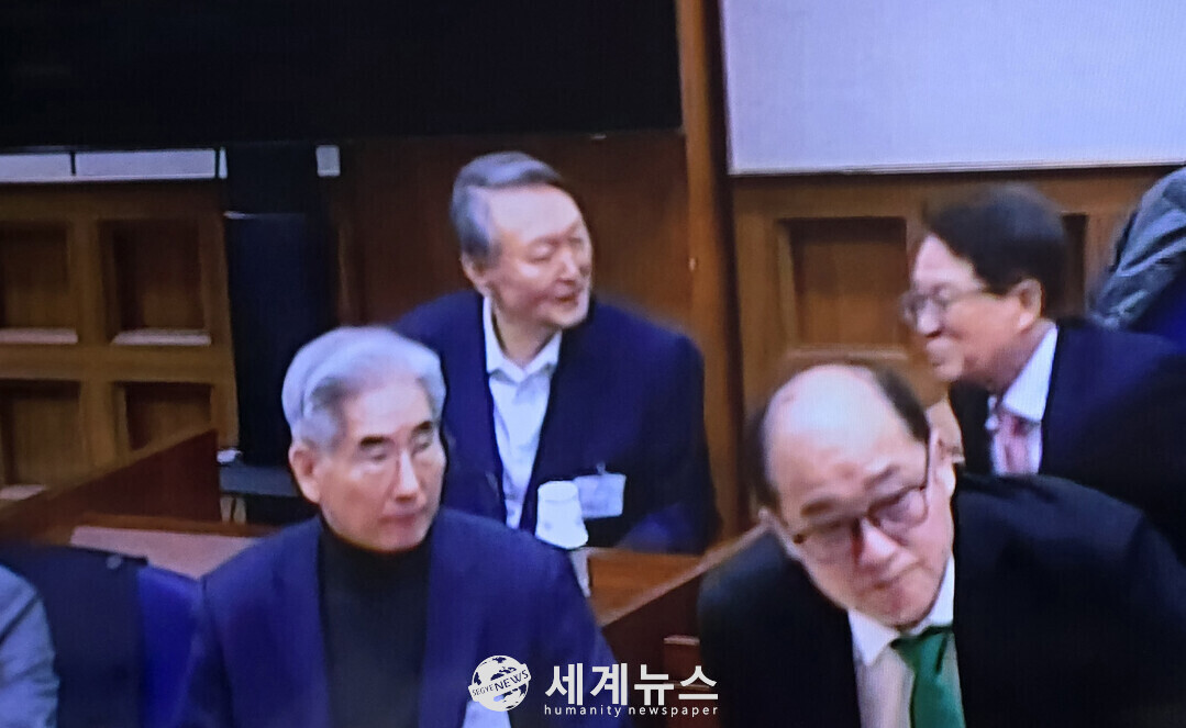 19일 서울중앙지법 형사25부 417호 법정에 들어선 윤석열 전 대통령이 변호인과 대화를 나누며 웃고 있는 모습.