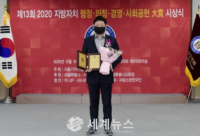 [세계뉴스 전승원 기자] 서울시의회 김재형 의원(더불어민주당, 광진4)은 지난 10일 서울기자연합회(회장 정상린)가 주최한 ‘2020 지방자치 행정·의정·경영대상’ 시상식에서 의정부문의 대상을 수상했다.