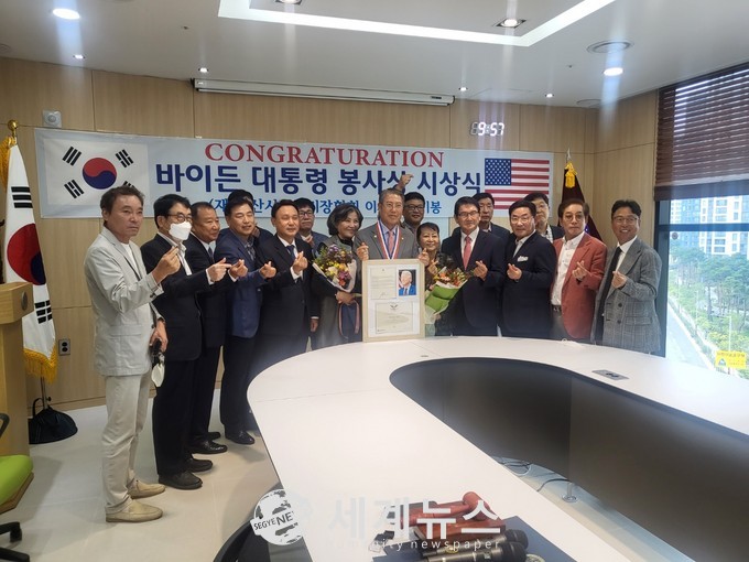 | ▲ 군산사회복지 장학회 김기봉 이사장이 죠 바이든 대통령 봉사상 금상을 수상하는 영예를 안았다. |