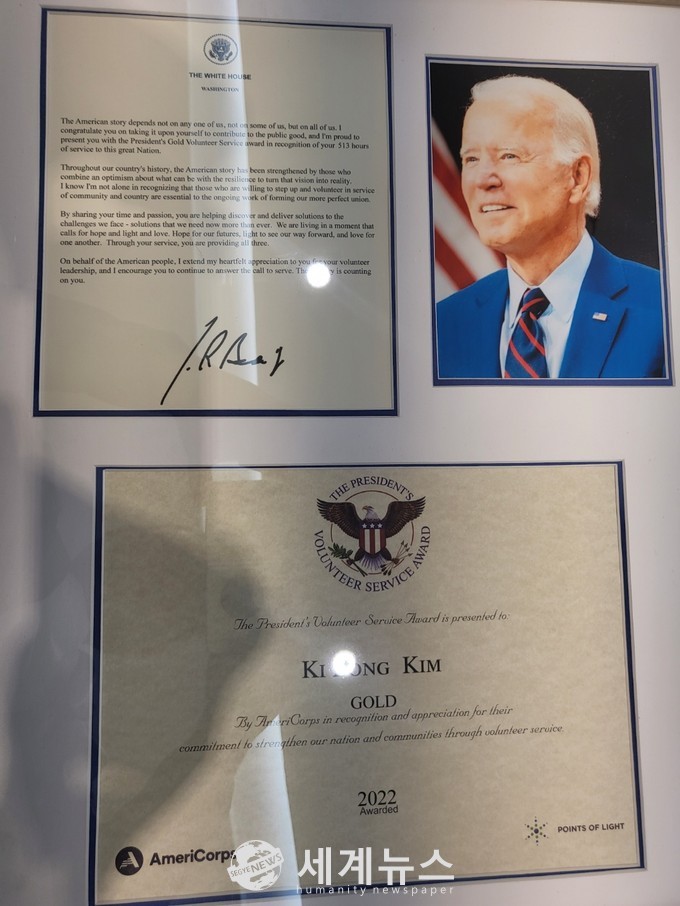김이사장은 1987년부터 현재까지도 지역사회에서 장학금과 사회복지시설, 경로행사, 소년소녀가장, 취약계층 등 국가와 지역사회에 사랑과 봉사를 실천해 대통령 표창, 국민훈장 목련장 등을 수상한 바 있으며, 그 공로를 인정받아 미국 죠 바이든 대통령 봉사상 금상 수상자로 선정됐다.