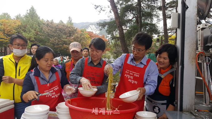 | ▲ 지난 22일 당고개공원(노원구 상계동)에서 열린 ‘세대공감 나눔콘서트’에서 안철수 국회의원(가운데)과 김광수 서울시의원(오른쪽)이 자장면을 그릇에 담고 있다. © 세계뉴스 |