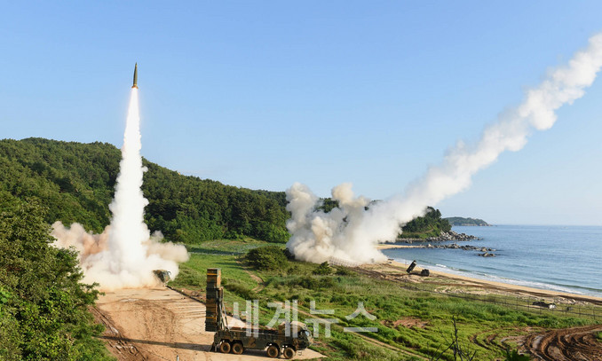 | ▲ 북한의 대륙간탄도미사일(ICBM) 도발에 대응해 5일 오전 동해안에서 열린 한미 연합 탄도미사일 타격훈련에서 한국군 탄도미사일 현무-2A(왼쪽)와 주한미군 에이태킴스(ATACMS)가 동시 발사되고 있다. © 세계뉴스 |