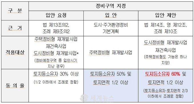 정비구역 지정을 위해 토지등소유자가 입안권자에게 ‘정비계획 입안 요청’을 하는 경우, 토지등소유자의 30퍼센트 이상의 동의가 있으면 입안 요청이 가능하다. 그리고 ‘정비계획 입안’ 시에는 「2030 도시·주거환경정비기본계획」을 통해 토지등소유자의 50퍼센트 이상 및 토지면적 2분의 1 이상으로 주민동의율 요건을 규정하고 있다. 한편, 토지등소유자가 직접 ‘정비계획 입안 제안’ 시에는 토지등 소유자의 60퍼센트 이상 및 토지면적의 2분의 1 이상의 동의를 받아야 한다.