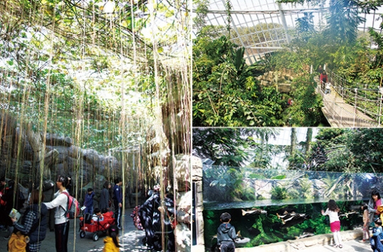 특히 지구에서 가장 큰 열대어로 알려진 피라루크를 마주하면 어른들은 탄성을, 어린이들은 잠시 얼음이 되곤 한다. 열대관 더 깊은 곳으로 들어가려면 치렁치렁하게 내려와 있는 뿌리식물 ‘시서스존’을 지나가게 된다. 피하지 않고 천천히 그 줄기와 스킨십을 하며 걷는 기분이 색다르다. ‘전기뱀장어’, ‘물총고기’, ‘머드스키퍼’, ‘알다브라육지거북’, ‘필리핀돛꼬리도마뱀’ 등 열대 동물들과 바나나나무, 고무나무, 캐논볼트리 등 이국의 생태를 관찰하노라면 무더위도 잊고 시간도 잊게 된다. 그 중 ‘필리핀돛꼬리도마뱀’은 재미있는 녀석이다. 관람객들의 움직임에 빠르게 반응하며 카메라를 들이대면 폼도 잡아주는 등 귀여움을 독차지 하고 있다.