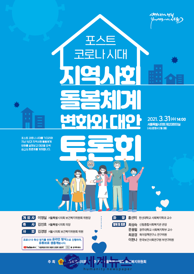 [세계뉴스 정서영 기자] 서울시의회 보건복지위원회 이영실 위원장(더불어민주당, 중랑1)은 코로나19 발생 이후 지금까지 서울시의 복지 분야 대응현황을 점검하고, 향후 복지 분야에 함의점과 정책 발전방향을 모색하기 위한 토론회를 개최한다.