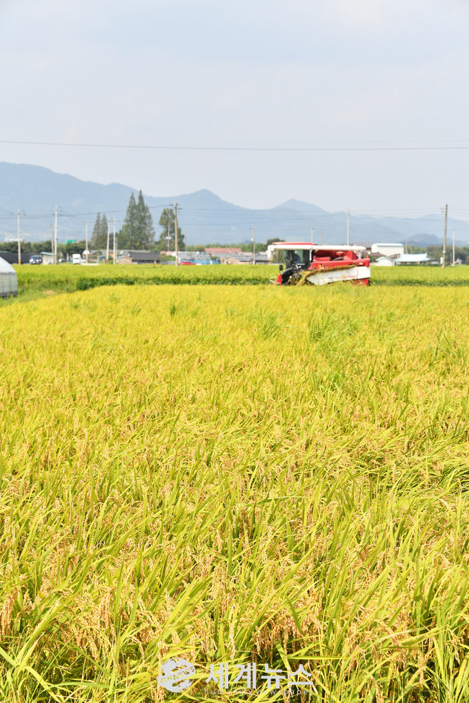 [세계뉴스 김형수 기자] 영산강 시원의 청정지역 담양의 ‘대숲맑은 조기햅쌀’이 4일 봉산면 삼지리 김덕수(67세) 농가의 햅쌀단지 0.8ha를 시작으로 본격적인 벼 베기에 들어갔다.