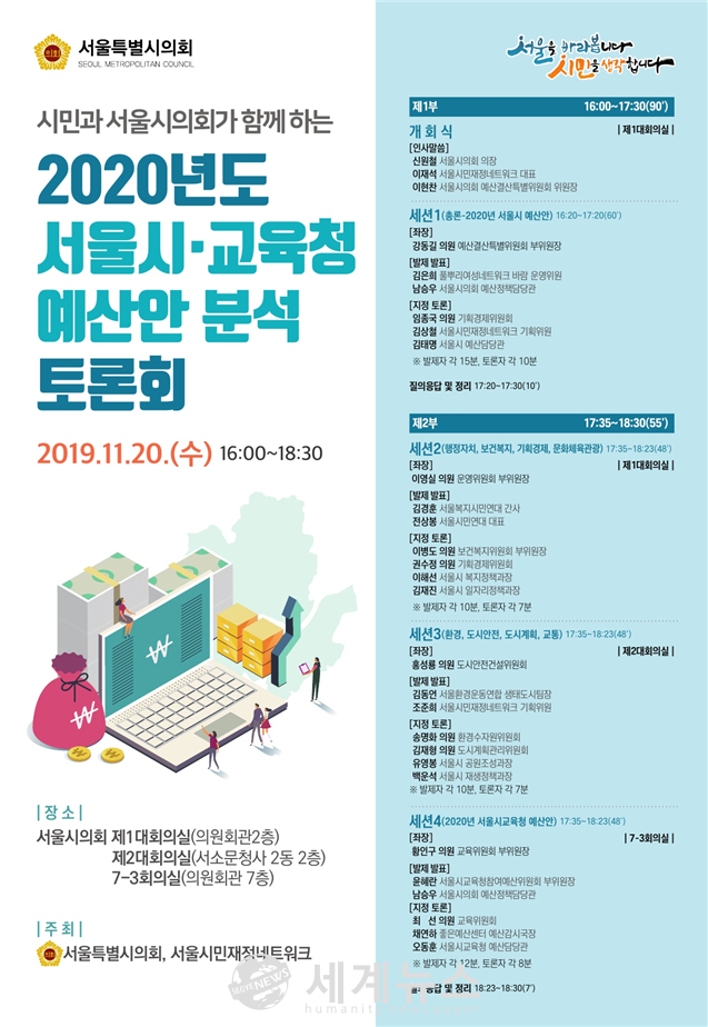 [세계뉴스 조홍식 기자] 서울특별시의회는 오는 20일 오후 4시부터 서울시의회(제1대회의실, 제2대회의실, 7-3회의실)에서 ‘시민과 서울시의회가 함께하는 2020회계연도 서울시·교육청 예산안 분석토론회’를 시민단체협의체인 서울시민재정네트워크와 공동으로 개최한다.