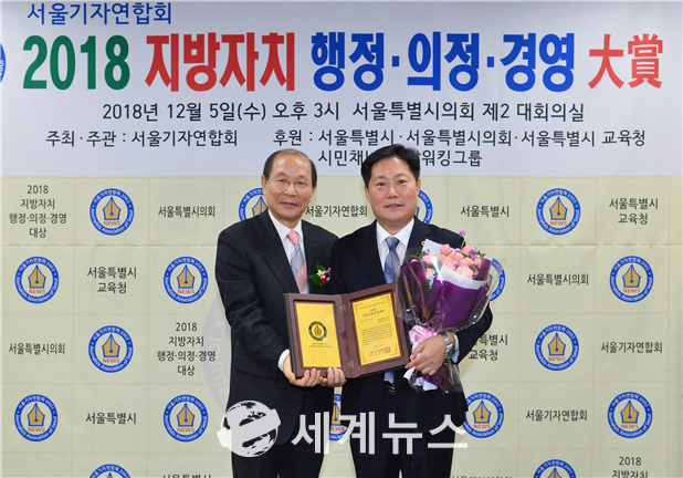 [세계뉴스] 전승원 기자 = 서울특별시의회 기획경제위원회 채인묵 부위원장(더불어민주당·금천1)은 지난 5일 서울특별시의회 의원회관 제2대회의실에서 서울기자연합회가 주관하고 서울특별시와 서울특별시의회에서 후원하는 ‘2018 지방자치 행정·의정·경영 大賞’ 에서 의정大賞을 수상하는 영예를 안았다.