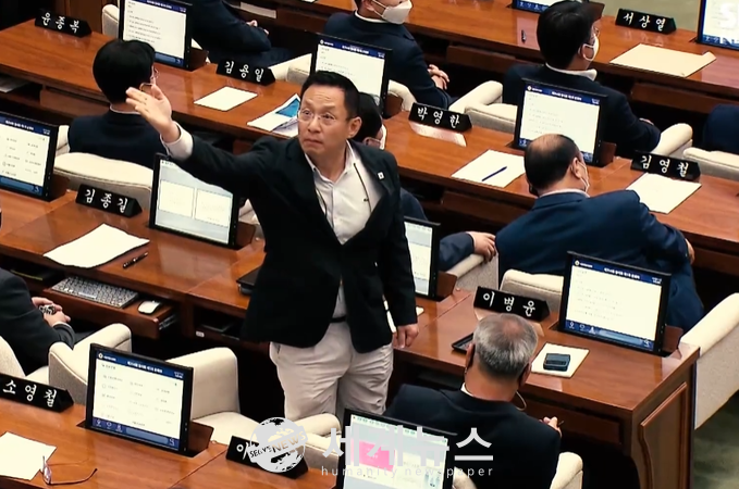 | ▲ 지난 14일 서울시의회 5분 자유발언 도중 국민의힘 소속 이승복 시의원(양천4선거구)이 마포구 주민들을 향해 “가세요”라며 소리치고 있는 모습. (SBS 유튜브 갈무리) |