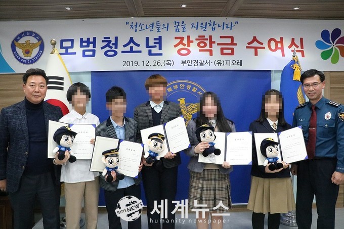[세계뉴스 윤준필 기자] 부안경찰서(서장 박훈기) 여성청소년계는지난 26일 2층 소회의실에서 경찰서장, (유)피오레 대표 등 총17명이 참석한 가운데 청소년 경제적 지원 및 희망 나눔을 위한 ‘희망 더하기 모범청소년 장학금 수여식’을 가졌다.