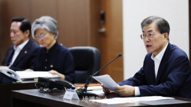 | ▲ 문재인 대통령이 29일 오전 1시 북한이 28일 밤 자강도 일대에서 동해상으로 탄도미사일로 추정되는 발사체를 기습 발사한 것과 관련해 긴급 국가안전보장회의(NSC) 전체회의를 소집해 발언하고 있다. (왼쪽부터) 송영무 국방부장관, 강경화 외교부장관. © 세계뉴스 |