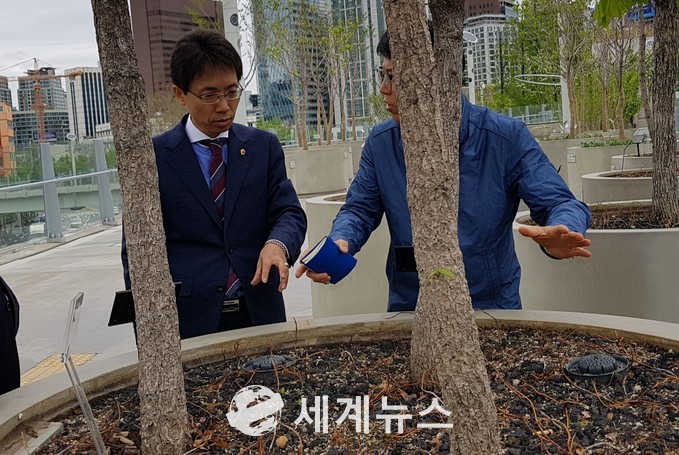 | ▲ 김광수 서울시의원이 '7017서울로' 현장을 찾아 서울로 관리자로부터 시설물에 대해 설명을 듣고 있다. |