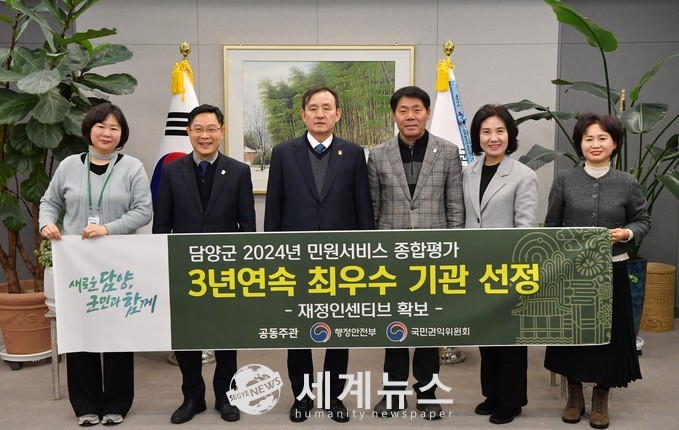[세계뉴스 양경희 기자] 담양군(군수 이병노)은 행정안전부와 국민권익위원회가 공동으로 주관하는 ‘2024년 민원서비스 종합평가’에서 3년 연속 최우수 기관에 선정되는 영예를 안았다.