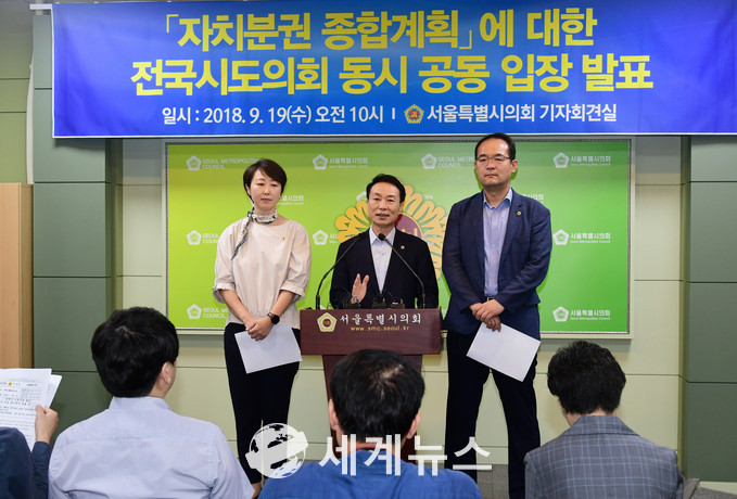 [세계뉴스] 정서영 기자 = 서울특별시의회 지방분권TF 김정태 단장은 19일 오전 10시 본관 의회기자회견장에서 지방분권 관련, 전국시도의회의 공동 입장을 발표했다.
