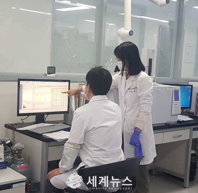 | ▲ 잔류농약 검사 사진 및 FAPAS 평가 참여 및 결과 통보를 연구진이 보고 있다.. |