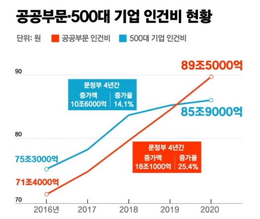 문재인 정부가 출범한 2017년부터 지난해까지 4년간 공공부문 인건비는 25.4%(18조1000억원) 급증했다. 같은 기간 500대 기업 인건비 상승률(14.1%, 10조6000억원)의 약 2배 가까운 수치다.