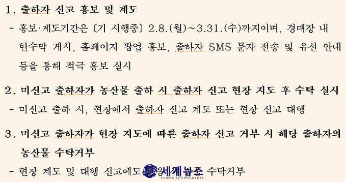 이런 문제를 개선하고자 공사에서는 지난해 여러 차례에 걸쳐 가락시장 출하 농산물의 수탁자(도매시장법인, 중도매인)를 대상으로 미신고 출하자에 대한 출하자 신고를 적극 계도한 바 있다.