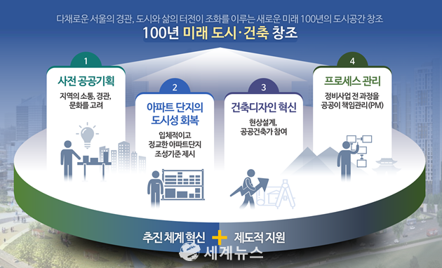 서울시가 발표한 도시‧건축혁신(안)의 주요 골자는 정비사업에 대한 ▴공공의 책임 있는 지원을 위한 ‘뉴 프로세스’ 실행 ▴‘사전 공공기획’ 단계 도입 ▴‘아파트단지의 도시성 회복’ ▴건축디자인 혁신, 4가지다. 이를 실현하기 위한 전문조직을 신설하고 제도적 지원도 병행한다.