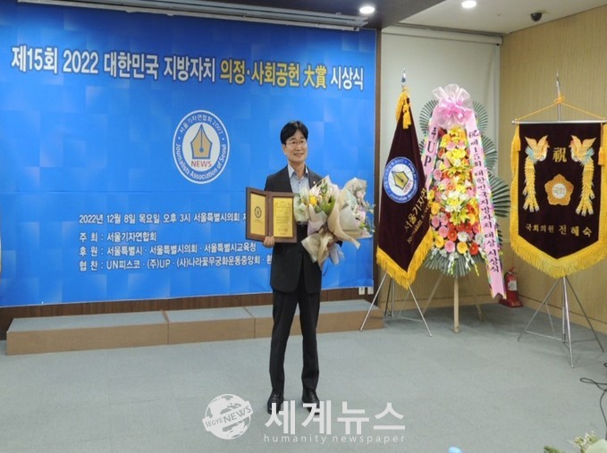 [세계뉴스 윤소라 기자] 서울시의회 도시계획균형위원회 김용일 의원(국민의힘, 서대문구4)은 8일 서울특별시의회 별관에서 개최된 ‘제15회 대한민국 지방자치 의정 대상’ 시상식에서 지방자치 의정 대상을 수상했다.