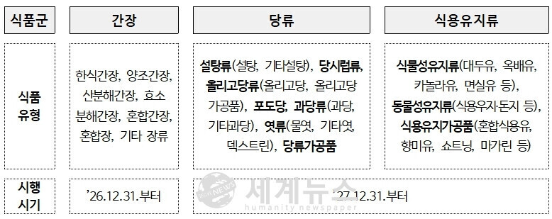 다만 업계의 준비 기간과 현장 혼란을 줄이기 위해 품목별로 단계적 시행에 나선다. 간장은 2026년 12월 31일부터 즉시 적용하고, 원료의 구분 관리와 설비 개보수가 상대적으로 많이 필요한 당류와 식용유지류는 2027년 12월 31일부터 시행한다.