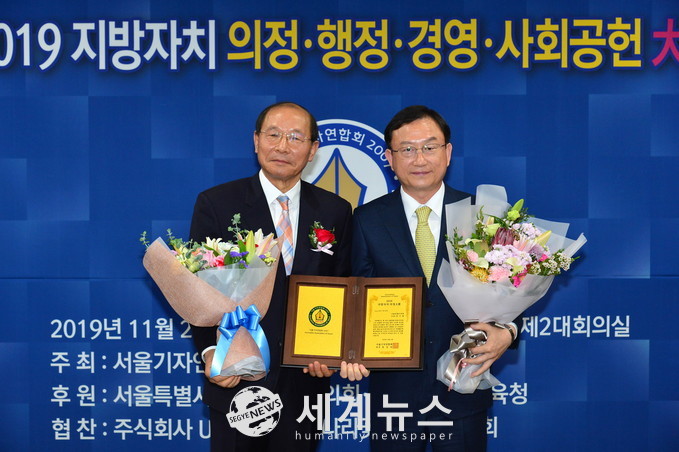 [세계뉴스 전승원 기자] 서울특별시의회 박기열 부의장(더불어민주당, 동작3)이 지난 21일 오후 3시 서울시의회의원회관 제2대회의실에서 열린 ‘제12회 2019 지방자치 의정.행정.경영.사회공헌 대상 시상식’에서 의정 대상을 수상했다.