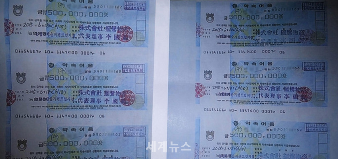 | ▲ 지난 5월26일 부도처리 된 파란물산이 발행한 30억원 상당의 '유가증권'. 이 어음에는 광고대행사 M사와 G시행사의 대표이사 배서가 찍혀있다. © 세계뉴스 |