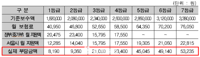 | ▲ 기준보수 등급별 보험료 및 월 지원액. |
