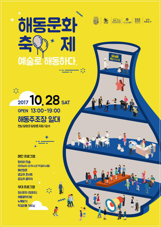 [세계뉴스] 전승원 기자 = (재)담양군문화재단은 오는 28일 토요일 오후 1시부터 7시까지 담양 해동주조장 일원에서 ‘해동문화축제-예술로 통하다’ 행사를 개최한다.