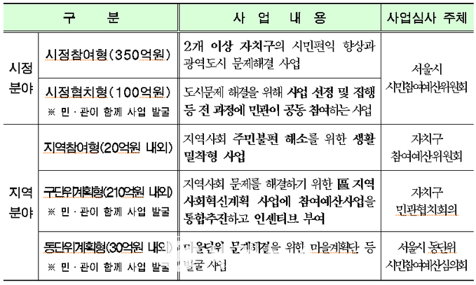 이번의 2020년 시민참여예산사업 공모대상 분야는 시정참여형(350억), 시정협치형(100억), 지역참여형(20억 내외)이며, 구·동단위계획형(240억 내외) 사업의 신청에 대해서는 서울혁신기획관에서 별도 안내할 예정이다.