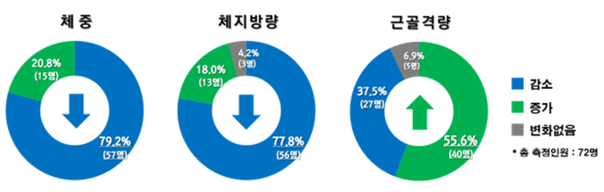 참여자의 79%(57명)가 체중이 감소했고, 체지방량이 감소한 참여자도 77%(56명)였다. 55%(40명)는 근골격량(뼈와 뼈 사이, 관절과 뼈 사이 근육)이 증가한 것으로 나타났다.