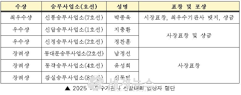 [세계뉴스 = 전승원 기자] 서울교통공사는 2025년 최우수기관사 선발대회를 통해 박종욱 기관사를 '최우수기관사'로 선정했다고 밝혔다.