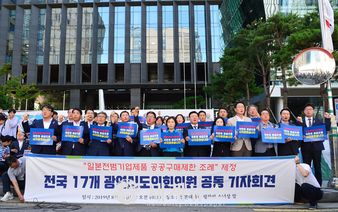 | ▲ 8월 14일 일본 전범기업 제품 공공구매 제한 조례 관련 전국 17개 광역의회 의원 공동 기자회견 모습. |