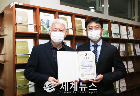 | ▲ 중소벤처기업부가 주관하는 ‘2021년도 대·중소기업 동반성장 유공포상’에서 손채호 도시철도연구원장(좌측), 실무담당 황문세 과장(우측)이 장관 표창을 받았다. |