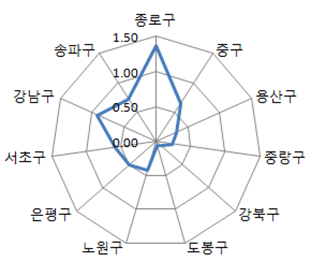 | ▲ 재정자립도 상·하위 자치구간 만명당 근린공원 시설수 © 세계뉴스 |