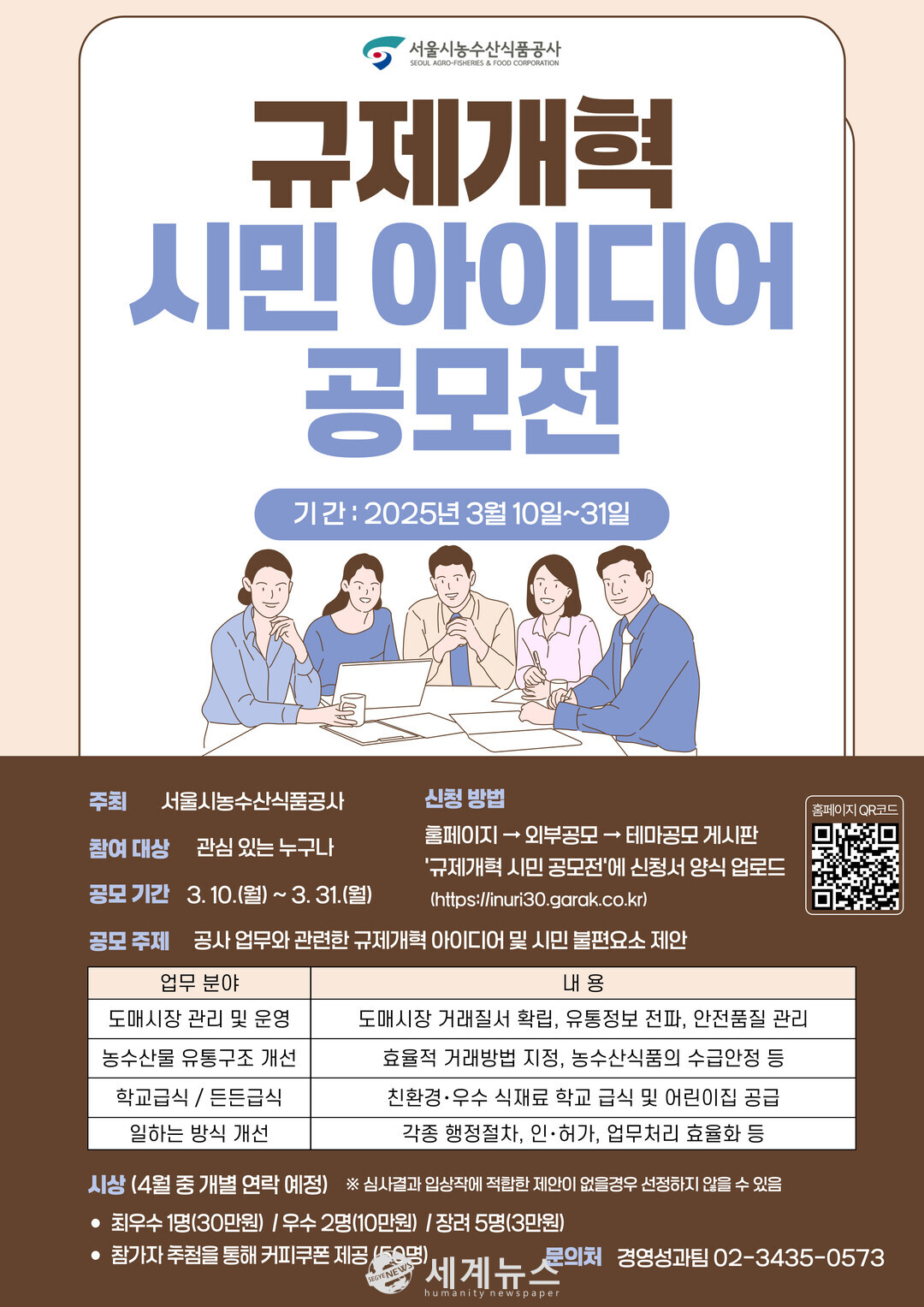 [세계뉴스 = 차성민 기자] 서울시농수산식품공사(사장 문영표)는 10일부터 31일까지 ‘규제개혁 아이디어 시민공모전’을 개최한다.