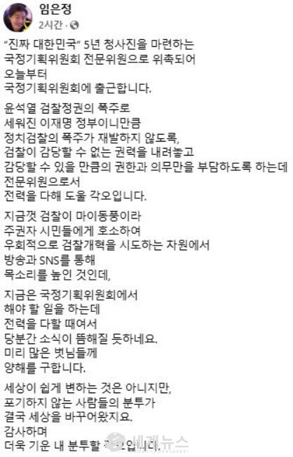 임 부장검사는 그동안 방송과 SNS를 통해 검찰개혁을 외쳐왔으며, 이제는 국정기획위에서 실질적인 변화를 위해 힘쓰겠다는 포부를 전했다. 그녀는 "세상이 쉽게 변하지 않지만, 포기하지 않는 사람들의 분투가 결국 세상을 바꿔왔다"며 앞으로의 행보에 대한 다짐을 밝혔다. 이러한 그녀의 의지는 검찰개혁의 실현에 중요한 역할을 할 것으로 기대된다.