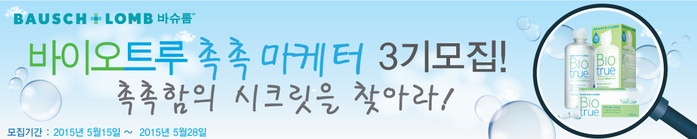 한편 바슈롬 공식 페이스북 페이지(https://www.facebook.com/BauschLombKR)에서 ‘바이오트루 촉촉마케터 3기’ 모집 관련 재미있는 사연을 동반한 친구 소환 이벤트가 진행 중이며 30명 추첨을 통하여 바슈롬의 ‘바이오트루 다목적 렌즈관리용액’과 특허 받은 보습 솔루션 ‘세라비 모이스춰라이징 로션’을 증정한다.