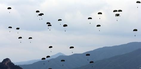 수송기 CN-235 3대에서 특전사 요원들 75명이 적진을 향해 집단 낙하산 강하를 펼치는 훈련도 선보였다.