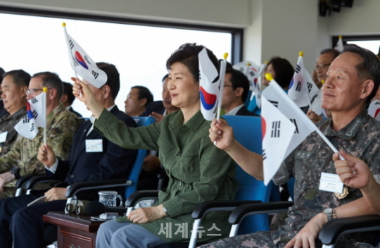 | ▲ 박근혜 대통령이 28일 경기도 포천 승진과학화훈련장에서 열린 '2015 통합화력 격멸훈련'에 참석했다. 이날 한미 양국 군 47개 부대 장병 2천여명과 장비 318대가 참가한 역대 최대규모의 화력시범이 펼쳐졌다. © 세계뉴스 |
