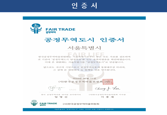 서울시는 인구 1천만 명 이상의 도시 중 세계 최초로 ‘공정무역도시’공식 인증을 받았다고 밝혔다. ‘12년 ‘공정무역도시 수도 서울’을 선언한지 6년 만에 성과다.