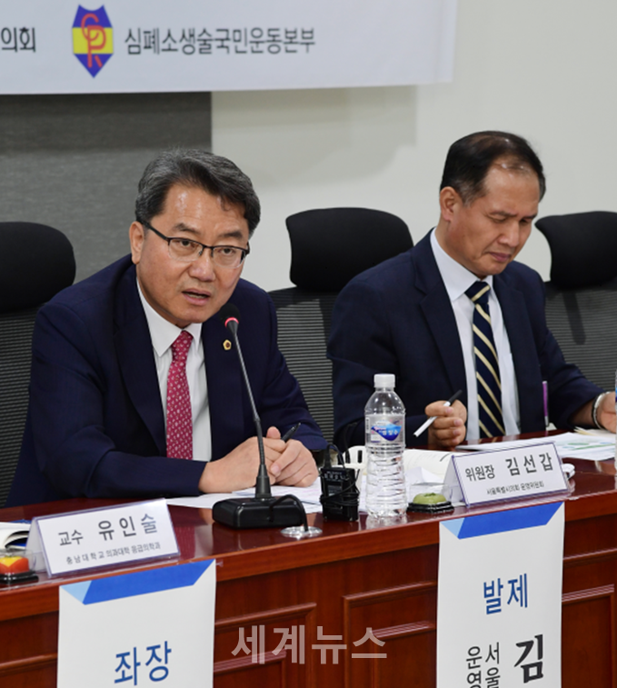 | ▲ 21일 국회의원회관에서 개최된 ‘시민안전 심폐소생술 세미나’ 주제발표자인 서울시의회 김선갑 운영위원장(왼쪽)이 옥외전광판을 활용한 심폐소생술 교육의 필요성을 강조하고 있다. © 세계뉴스 |