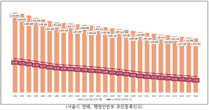 | ▲ 서울시 14세 인구 이하 변화. |
